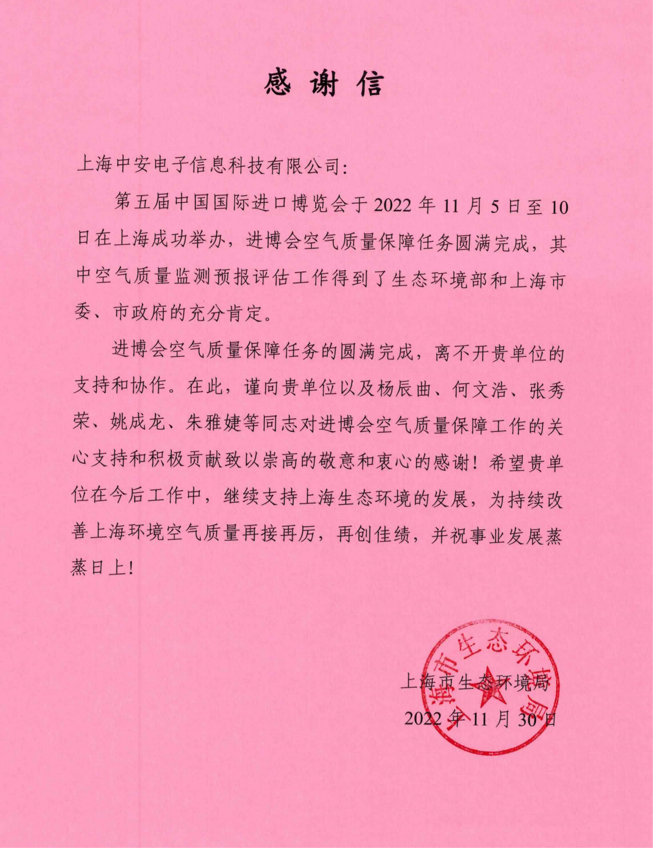 上海環(huán)監(jiān)中心就中安科技在21年國際進博會空氣質(zhì)量監(jiān)測預(yù)報工作中杰出貢獻送來感謝信!(2021/12/31)